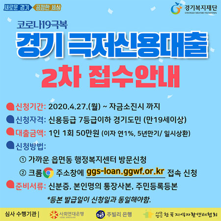 경기도 극저신용 대출 2차 신청은 5월 중으로 연기되었어요.