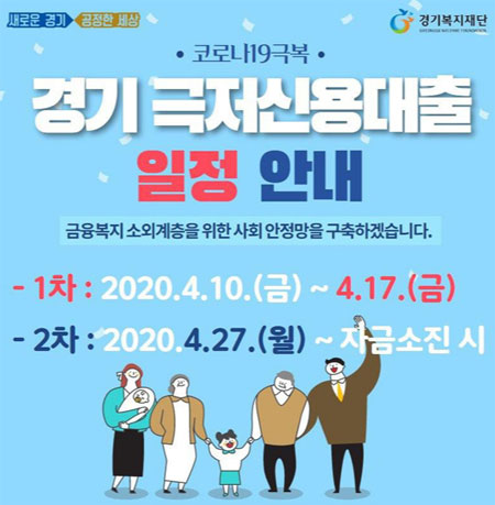 경기도 극저신용 대출 사업은 코로나 사태로 인한 경제위기 극복 대책의 하나인데요. 경기도 극저신용대출은 전국에서 처음 시행되는 극저신용자 대출이라고 해요. 신용등급 7등급 이하로 신용등급이 낮은 경기도민을 대상으로 이뤄진 대출이죠. 지난1차 신청은 마감되었구요. 이에 경기도는 4월 27일부터 2차신청을 받을 예정이였지만 5월로 연기되었다고 해요.