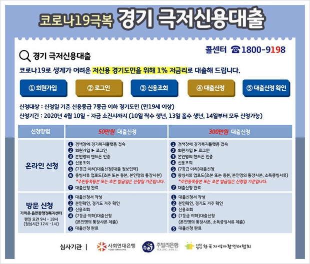 참고로 경기도 극저신용대출은 사회연대은행, 롤링쥬빌리, 한국자활센터협회 등 3곳이 대출 대행을 맡았는데요. 자세한 방법과 문의 사항은 5월 중 2차로 운영되는 '경기 극저신용대출 사업' 전용 콜센터를 이용하면 된다고 해요.