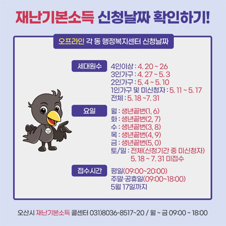 세대원수 별 방문 신청기간은 ▷4인 이상 가구는 오는 20~26일 ▷3인 가구는 오는 27일~5월 3일 ▷2인 가구는 5월 4~10일 ▷1인 가구와 미신청자는 5월 11~17일 ▷5월 18일부터 7월 31일까지는 누구나 신청할 수 있습니다. 자세한 내용은 오산시 홈페이지나 공식블로그 등을 확인하거나 오산시 재난기본소득 콜센터(031- 8036 - 8517~20)로 문의하면 됩니다.