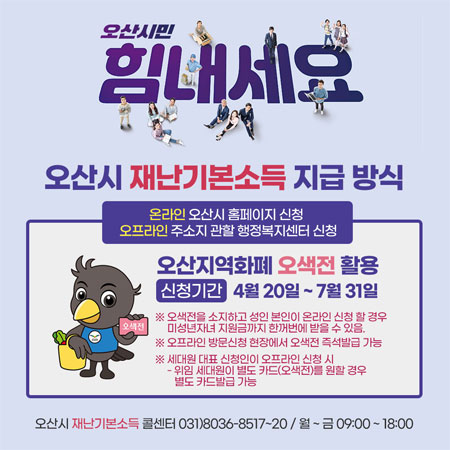 오산시 재난기본소득 지급방식은 오색전 지역화폐를 보유한 시민은 온라인 신청으로 이미 보유하고 있는 지역화폐 카드에 지급합니다.. 지역화폐가 없는 경우에는 방문 신청 시 현장에서 즉석으로 발급받을 수 있습니다. 지역화폐를 보유한 경우에도 온라인 신청이 곤란한 경우 방문해 신청할 수 있습니다.