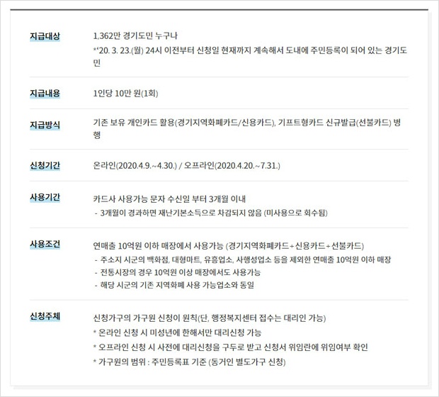▶ 나이, 소득, 자산, 성별, 직업 등을 가리지 않고 경기도민이기만 하면 1인당 1회 10만원을 지급.