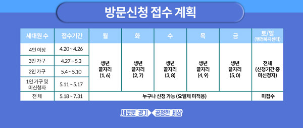 ▶ 접수 1주차(4.20~26)에는 4인 가구 이상, 2주차(4.27~5.3) 3인 가구, 3주차(5.4~10) 2인 가구, 4주차(5.11~5.17)까지는 1인 가구 또는 신청하지 못한 나머지 가구가 신청.