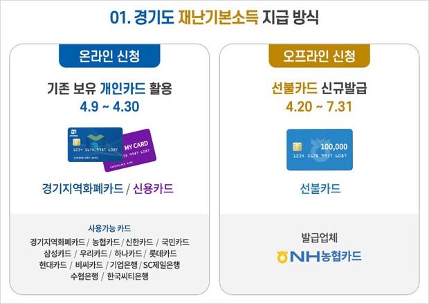 ▶ 경기지역화폐나 신용카드 등 기존 보유 개인카드를 활용하는 방식과 선불카드인 기프트형 카드를 신규발급 받아 지급하는 방식.
