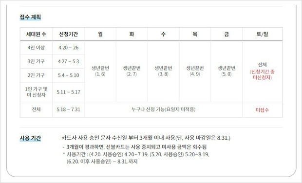 ▶ 선불카드의 신청기간은 4월 20일부터 7월 31일까지, 역시 유효기간은 3개월.