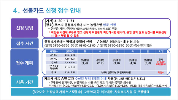 선불카드 이용 시 방문접수가 몰릴 경우에 대비해 가구원 수에 따라 신청기간이 다르기 때문에 참고해야 하는데요. 접수 1주차(4.20~26)에는 4인 가구 이상, 2주차(4.27~5.3) 3인 가구, 3주차(5.4~10) 2인 가구, 4주차(5.11~5.17)까지는 1인 가구 또는 신청하지 못한 나머지 가구가 신청할 수 있다고 해요.