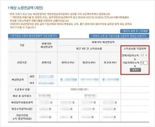특히 예상수령액은 현재 기준과 최근 5년간 소득상승률에 따라 달라진다고 하는데요. 오른쪽 상단에서 본인이 직접 선택해서 비교할 수 있다고 해요.