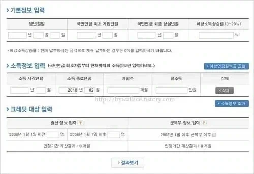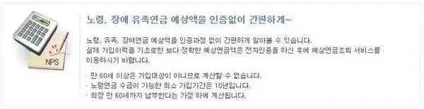 다만 만 60세 이상은 가입대상이 아니기 때문에 계산할 수 없다고 하구요. 또한 노령연금 수급이 가능한 최소 가입기간이 10년이 되어야 한다고 해요. 예상연금 모의계산 항목은 최장 만 60세까지 납부한다는 가정 하에 계산되기 때문에 이 점은 참고해야 해요.