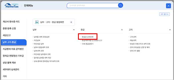 숨은 환급금 조회하기 찾기 서비스 국세 환급금 조회 방법은 국세청 홈택스 홈페이지 전체메뉴 항목을 통해서도 가능한데요. 전체메뉴를 클릭하시구요. 다음으로 납부 고지 환급 항목을 클릭해 주세요.