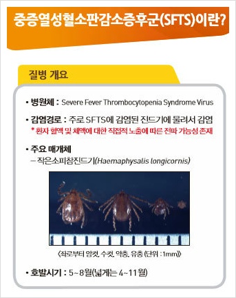 SFTS는 중증열성혈소판감소증후군(Severe Fever withThrombocytopenia Syndrome, SFTS)를 뜻하는데요. 보통 고열과 함께 혈소판이 감소하는 증상이 나타나며 SFTS 바이러스에 의해 발생한다고 해요.