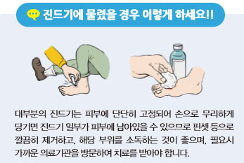 대부분의 진드기는 피부에 단단히 고정되어 손으로 무리하게 당기면 진드기 일부가 피부에 남아있을 수 있으므로 핀셋 등으로 깔끔히 제거하고, 해당 부위를 소독하는 것이 좋으며, 필요시 가까운 의료기관을 방문하여 치료를 받아야 한다고 해요.