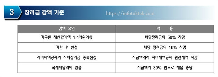 또한 기한 후 신청한 경우에는 해당 장려금에서 10%가 차감되어 지급되며 소득세 자녀세액공제를 받은 경우에는 지급액에서 자녀세액공제 해당세액이 차감됩니다. 만약 국세 체납액이 있다면 지급액의 30% 한도로 체납충당이 되기 때문에 이 부분은 반드시 확인해야 합니다.