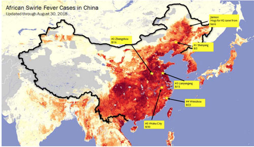 아프리카와 유럽에서 주로 발생하다 작년 8월 중국 아프리카 돼지열병 바이러스가 처음 발견되었고 이후 8개월 만에 110건이 넘을 정도로 빠르게 확산했습니다. 이에 중국 정부는 100만 마리 넘는 돼지를 살처분했다고 합니다.