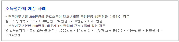 근로소득에서 기본 94만 원을 공제한 다음 이에 30%를 더 공제한 금액에 기타 소득을 더하면 소득평가액이 나오는데요. 사업소득, 재산소득, 공적이전소득, 무료 임차 소득 등이 기타 소득이며 이는 공제하지 않고 그대로 반영한다고 해요.