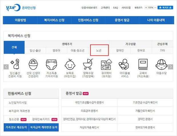 복지로 홈페이지 복지서비스 신청에서 생애주기 노년을 클릭하면