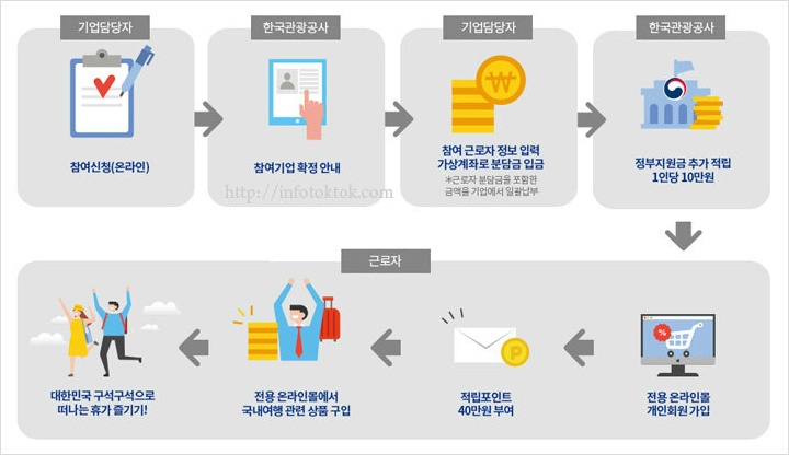 근로자 휴가지원 사업이란 직장내 자유로운 휴가문화 조성과 국내여행 활성화를 위해 지난해 국정과제로 도입됐습니다. 근로자 휴가지원 사업은 근로자가 20만 원을 부담하면 기업 10만 원, 정부 10만 원을 함께 지원해 적립금 40만 원을 휴가시 국내여행 경비로 사용하는 것으로서 3월까지 참여 기업과 근로자 모집 및 적립금 조성을 완료하고, 4월부터 내년 2월까지 사용하는 일정으로 진행됩니다.
