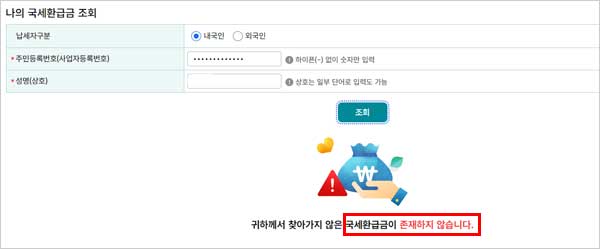 국세청 환급금 조회 결과 국세환급금이 존재하지 않는다고 나왔네요. 지급할 금액이 없다는 뜻이랍니다.