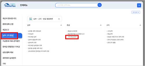 숨은 환급금 찾기 서비스 신청 받기 국세 환급금 조회 방법은 국세청 홈택스 홈페이지 전체메뉴 항목을 통해서도 가능한데요. 전체메뉴를 클릭하시구요. 다음으로 납부 고지 환급 항목을 클릭해 주세요.