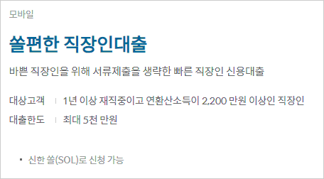 신한은행 홈페이지에서 안내하고 있는 신한은행 직장인 신용대출 상품은 비대면으로 간편하게 신청할 수 있는 대출상품입니다. 마이너스 통장이 가능한 신용대출 상품으로서, 바쁜 직장인을 위해 서류제출을 생략한 신용대출입니다.