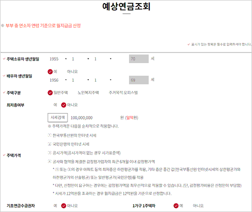 연령은 부부 중 나이가 젊으신 연소자 나이를 기준으로 합니다. 주택연금 월지급금은 주택가격이 동일하다면 연령이 높을수록 많아지게 되고, 연령이 낮을수록 월지급금이 줄어들게 됩니다.