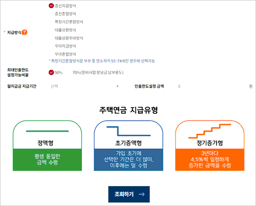 먼저 주택소유자와 배우자 생년월일은 입력합니다. 임의로 70세와 배우자는 69세를 입력해 보았습니다. 주택구분은 일반주택을 선택한 후 지급방식은 종신지급방식, 월지급금 지급유형은 정액형을 선택했습니다. 인출한도설정 금액은 종신지급방식 및 우대지급방식을 제외한 지급방식에서 선택이 가능합니다.