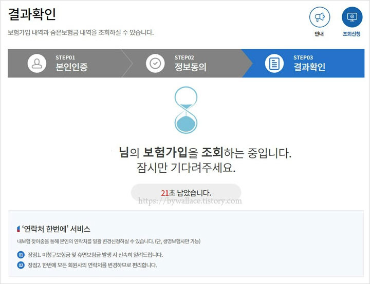 본인인증 절차가 끝나고 나면 보험가입을 조회하는 중입니다라고 하는 안내와 함께 시간이 표시되는데요. 이용하는 분들이 많지 않다면 큰 불편함 없이 쉽게 조회가 가능하다고 해요.