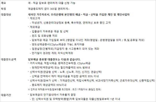 우리은행 예금 적금 담보대출 한도 및 상환방법, 필요서류, 대출기간, 중도상환수수료, 신청 대상 자격 조건 알아보기