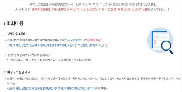 구분의 보험계약은 접수일 현재 조회대상자가 보험계약자나 피보험자로 되어 있는 유지계약, 실효계약, 만기계약 및 휴면계약이며, 보험금, 제환급금 등의 지급이 종결된 계약은 계약 종료 후 3년 이내인 경우 조회된다고 하구요. 특히 우체국, 수협, 신협, 새마을금고 등에서 가입한 보험 및 공제상품은 조회내용에 포함되지 않는다고 해요.