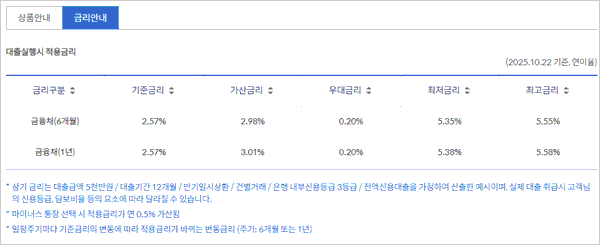 - 대출금리는 차주 신용도별 차등 적용되며 대출 이자 미납 및 대출 만기 후 미상환시에는 여신거래 약정에서 정한 기간별 연체이율이 적용되고 신용정보관리대상 등록 등의 불이익을 받을 수 있다고 합니다.