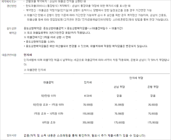 계약해지 또는 갱신방법에 대해 알아보면 건별대출 계약해지는 고객이 대출금 전액을 상환한 때이며 한도대출(마이너스통장방식) 계약해지는 고객이 통장대출 약정에 대한 해지의사를 표시한 때라고 해요. 계약갱신에 대해 알아보면 대출금은 약정기일(만기일)에 상환이 원칙이지만 하나은행에서 정한 일정요건을 갖춘 경우 기한 연장 가능하다고 하는데요.