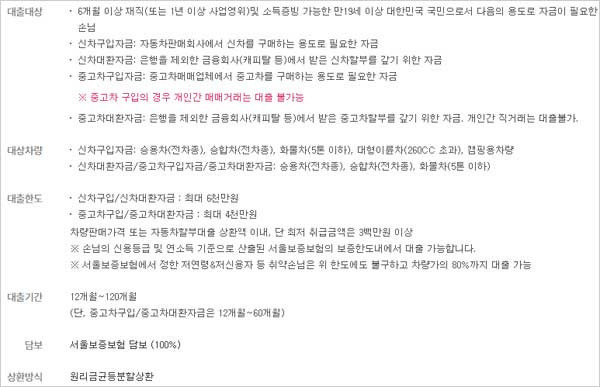 신용등급 및 연소득 기준으로 산출된 서울보증보험의 보증한도내에서 대출이 가능하구요. 서울보증보험에서 정한 저연령 및 저신용자 등은 위 한도에도 불구하고 차량가의 80%까지 대출이 가능하다고 해요.
