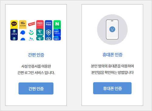 접속한 후에 개인정보 활용에 동의하고, 공동인증서, 간편인증(카카오페이, 네이버 등), 또는 휴대폰 본인인증을 통해 본인 확인 절차를 진행하면 돼요.
