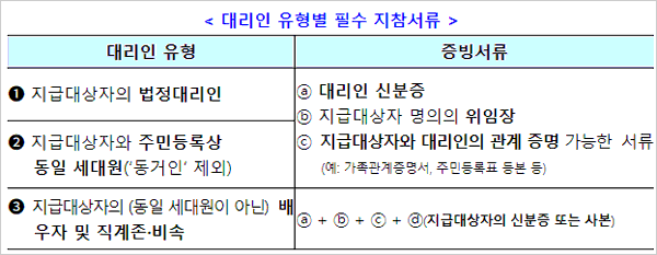 대리인 유형별 필수 지참서류는 다음과 같은데요. ➊ 지급대상자의 법정대리인 및 ➋ 지급대상자와 주민등록상 동일 세대원(‘동거인’ 제외)은 ⓐ 대리인 신분증, ⓑ 지급대상자 명의의 위임장, ⓒ 지급대상자와 대리인의 관계 증명 가능한 서류(예: 가족관계증명서, 주민등록표 등본 등)가 필요하구요.