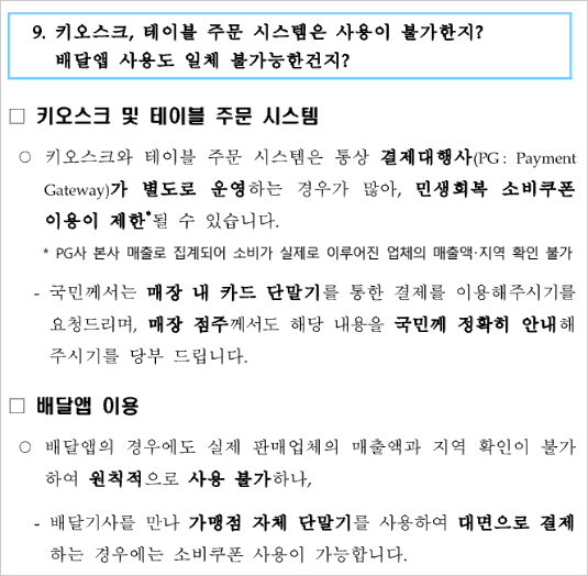 민생회복 지원금 소비쿠폰 사용처 중 키오스크와 테이블 주문 시스템은 통상 결제대행사(PG : Payment Gateway)가 별도로 운영하는 경우가 많아, 민생회복 소비쿠폰 이용이 제한(PG사 본사 매출로 집계되어 소비가 실제로 이루어진 업체의 매출액 및 지역 확인 불가) 될 수 있다고 해요. 따라서 매장 내 카드 단말기를 통한 결제 이용이 필요하며, 매장 점주 또한 해당 내용에 대한 정확한 안내가 필요하다고 해요.