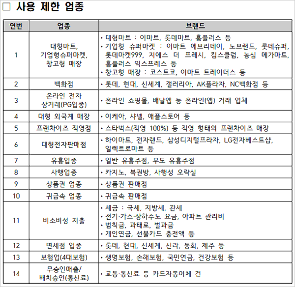 민생회복 소비쿠폰 사용처 이케아, 샤넬, 애플스토어 등 해외 글로벌 브랜드 매장에서도 소비쿠폰 사용이 불가능하구요. 하이마트, 전자랜드, 삼성디지털프라자, LG전자베스트샵, 일렉트로 마트 등 가전제품 전문매장도 제외된다고 해요.