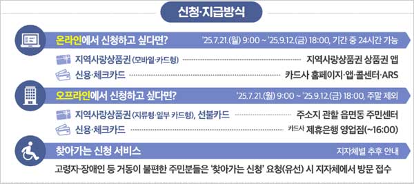 모바일 또는 카드형 지역화폐 지급을 희망하는 국민은 주소지 관할지방자치단체의 지역사랑상품권 앱 또는 누리집에서 온라인으로 신청할 수 있는데요. 신청한 다음 날 지급될 예정이라고 해요.