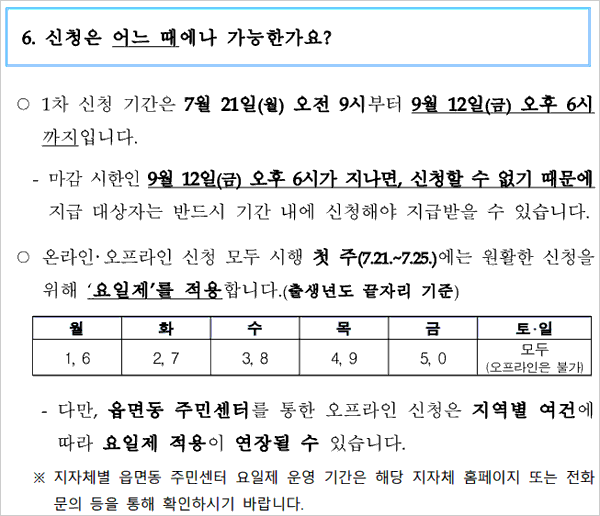 온,오프라인 모두 신청 첫 주에는 혼잡 및 시스템 과부하를 막기 위해 출생년도 끝자리를 기준으로 요일제가 적용되구요. 오프라인의 경우 지역 여건에 따라 요일제 적용이 연장될 수 있다고 해요. 예컨대 월요일은 주민등록번호 끝자리가 1, 6 화요일은 2, 7 수요일은 3, 8 목요일은 4, 9 금요일은 5, 0 주말은 모두 신청 가능하다고 해요.