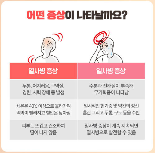 제때 치료하지 않으면 생명까지 위협할 수 있으니 즉시 119에 신고하고 병원으로 이송해야 한답니다. 의식 변화, 땀이 나지 않음(주로), 체온 40°C 이상, 경련 또는 발작, 빠르고 강한 맥박, 피부 붉고 뜨거움 등이 열사병의 주요 증상이죠.