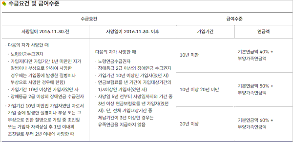 - 국민연금 가입 기간이 10년 이상인 사람이 사망했을 때.