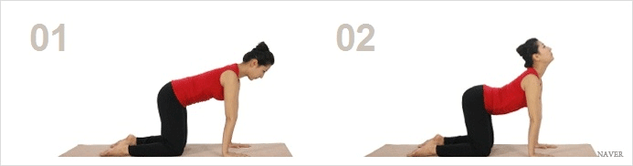 변비 직빵 해결방법 운동자세 중 고양이 자세는 장의 기능을 도와주고 힙업에도 아주 좋은 자세라고 하는데요. 먼저 양쪽 무릎과 손바닥을 바닥에 대고 엎드려 주세요. 엎드린 자세에서 어깨 넓이로 벌려준 후에 등은 하늘을 향하게 끌어 올려주세요. 머리는 양팔 안쪽으로 넣어주면 고양이 자세가 된다고 하는데요. 반복운동을 하면 좋다고 해요.