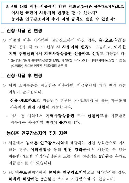 민생회복지원금 인구소멸지역 이사 후 사용지역 변경이 가능할까요? 6월 18일 이후 서울에서 인천 강화군(농어촌 인구감소지역)으로 이사한 국민이 사용지역 변경을 할 수 있을까요? 농어촌 인구감소지역 추가 지원 금액도 받을 수 있을까요?