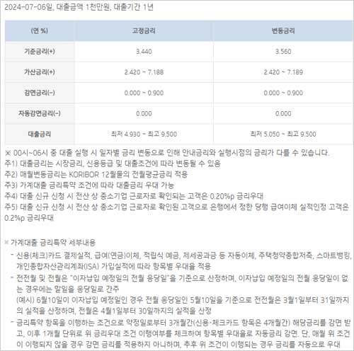 ▶기업은행 비상금대출 금리 이자 이율은 2024년 7월 6일 현재 기준 다음과 같으며 대출금액 1천만원, 대출기간 1년 기준에 대한 금리 이자 이율이라고 합니다.