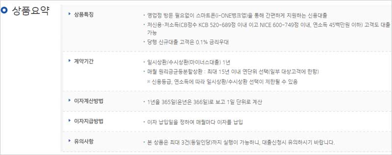 ▶ 중도상환수수료 또한 전액면제라고 하며 ▶ 신청 방법은 스마트폰(i-ONE뱅크앱)을 통해 무방문, 무서류, 무담보로 간편하게 지원이 가능하며 ▶ 대출금은 신청 당일 고객 지정계좌로 입금된다고 합니다.