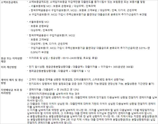 - 대출가능여부 및 최종대출금액은 신용도, 소득, 담보방식, 보유중인 다른대출 등에 따라 달라질 수 있다고 합니다.