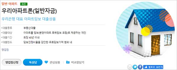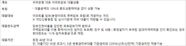 대출금액의 10%내 중도상환해약금 없이 상환이 가능한 대출 상품인 우리은행 아파트담보대출 신청 대상 자격 조건은 아파트를 담보(분양아파트 후취담보 포함)로 제공하는 개인이라고 합니다.