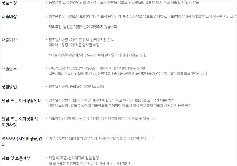 본인명의의 예금을 담보로 인터넷(모바일)뱅킹에서 직접 대출할 수 있는 상품인 농협 예금담보대출 신청 대상 자격 조건은 농협은행 인터넷(스마트)뱅킹 가입자로서 본인명의 예금 적금/신탁을 담보로 인터넷(스마트)뱅킹상에서 대출을 받고자 하시는 개인고객이라고 합니다.