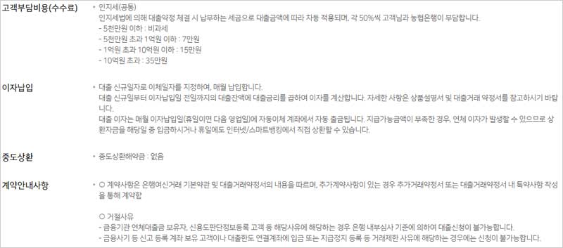 - 대출금 입금계좌 및 대출약정계좌는 농협은행 계좌만 가능하다고 합니다.