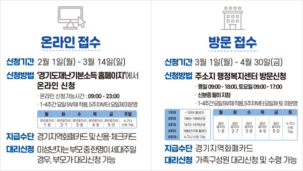 신청은 접속자가 몰리는 것을 예방하기 위해 2월 28일까지 4주 동안은 5부제를 실시합니다. 생년 끝자리가 1과 6인 도민은 월요일, 2와 7은 화요일, 3과 8은 수요일, 4와 9는 목요일, 5와 0은 금요일에 신청할 수 있습니다. 다만 토요일과 일요일은 출생년도와 관계없이 모두 신청할 수 있으며 5주차인 3월 1일~14일에는 주중에도 요일별 5부제가 적용되지 않는다고 합니다.