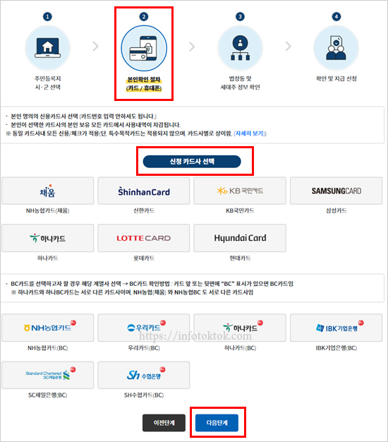인증이 모두 완료되면 신청 카드사 선택 항목이 나옵니다. 본인 명의의 신용카드사를 선택한 후 다음 단계를 클릭합니다. 이후 법정동 및 세대주 정보 확인에서 법정동명과 세대주 성명, 세대주와의 관계를 선택한 후 조회를 클릭합니다