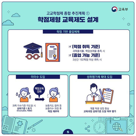 앞에서 언급했듯이 고교학점제는 학생들이 진로에 따라 다양한 과목을 선택 및 이수하고 누적학점이 기준에 도달할 경우 학년에 관계없이 졸업을 인정받는 제도입니다. 대학 입시에 초점을 맞춘 획일적 교육과정 대신 학생 개인의 진로와 적성에 따른 맞춤형 교육과정을 제공한다는 취지로 추진되었습니다. 대통령의 대표 교육 공약 중 하나라고 합니다.